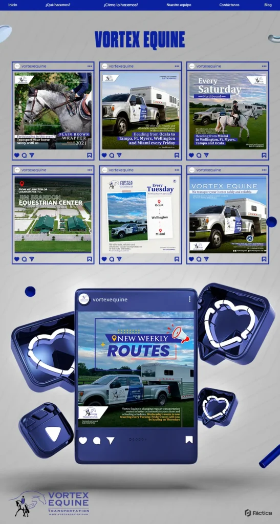 Junto a @vortexequine pretendemos darlos a conocer y consolidar su posicionamiento en el ámbito del transporte equino en Florida, Estados Unidos🐴. Primero, realizamos una investigación 💻 sobre el público objetivo, lo categorizamos según sus necesidades y mejoramos su contenido utilizando diversas herramientas proporcionadas por las plataformas de redes sociales.